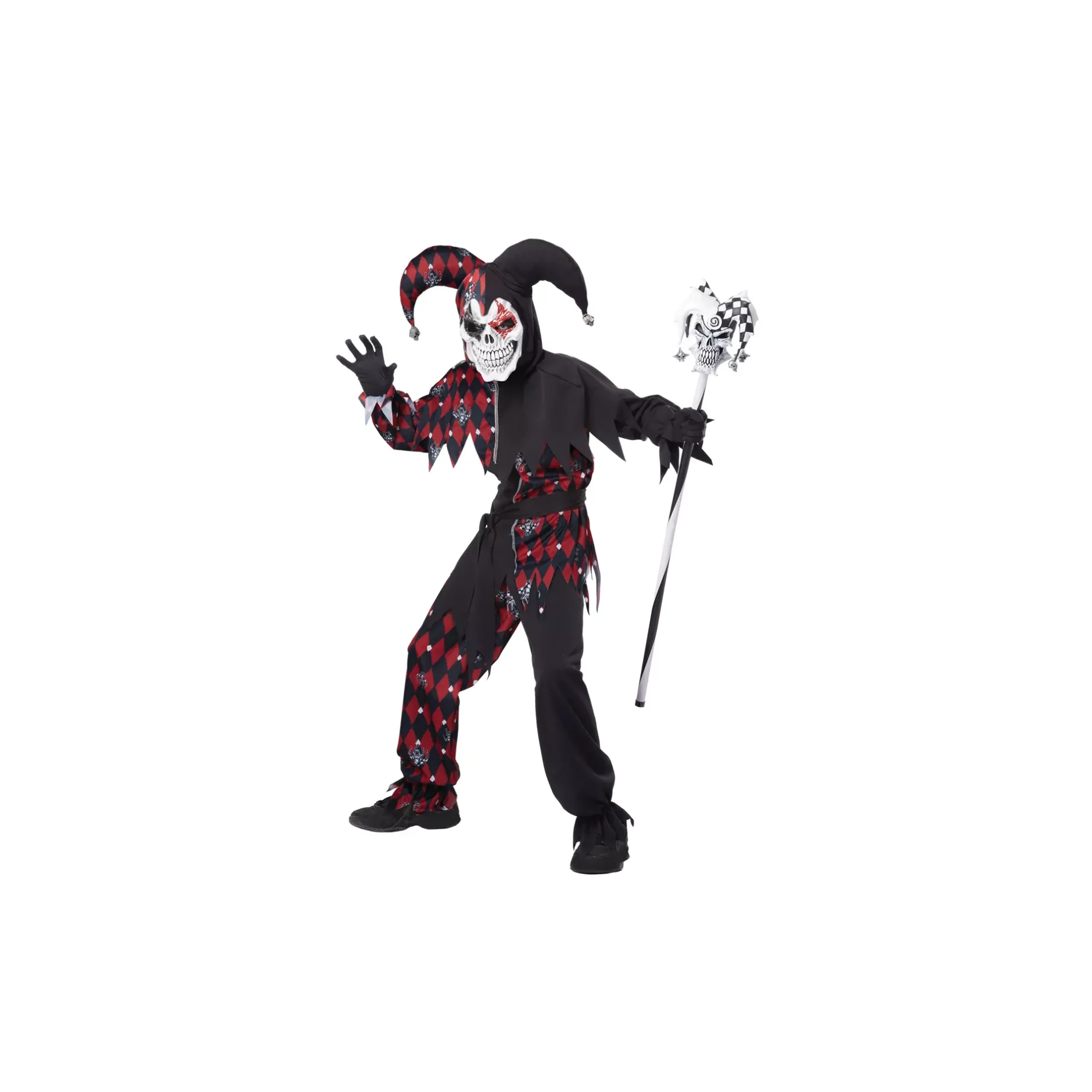 You’ll have the last laugh in this terrifying jester costume! This red and black, harlequin-design outfit consists of a shirt, matching pants, waist sash, hood with attached collar and creepy jester mask. Looks like the joke is on you!