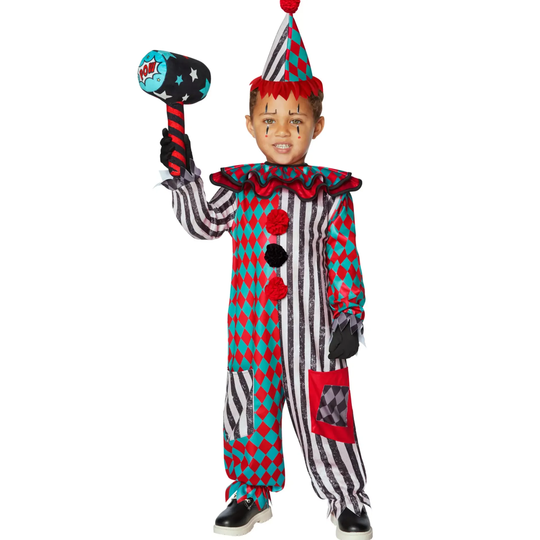Get ready to clown around in this circus-ready costume! This clown costume features a jumpsuit adorned with playful poms and a mix of patterns and colors. An oversized neck ruffle, matching hat, and black gloves create a lively head-to-toe clown ensemble. What tricks do you have hiding up your sleeve?