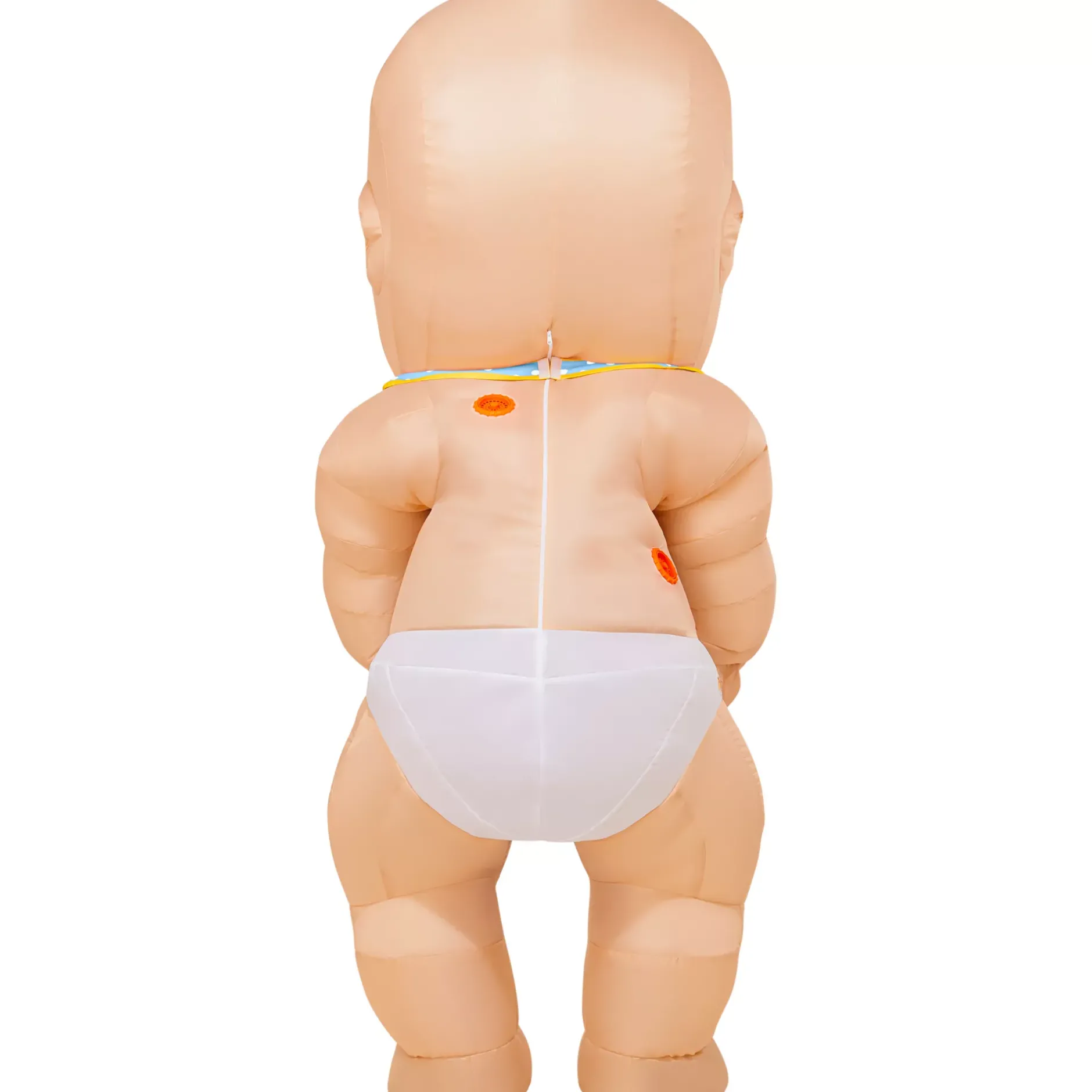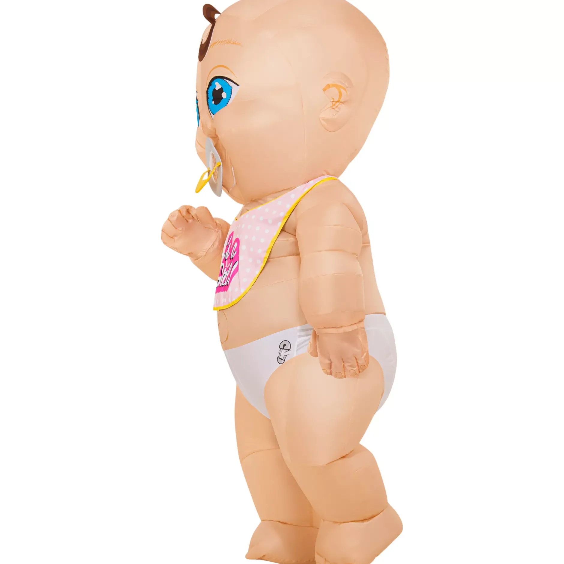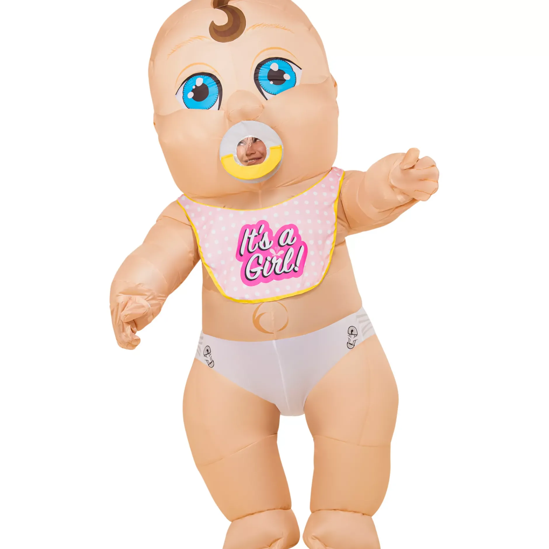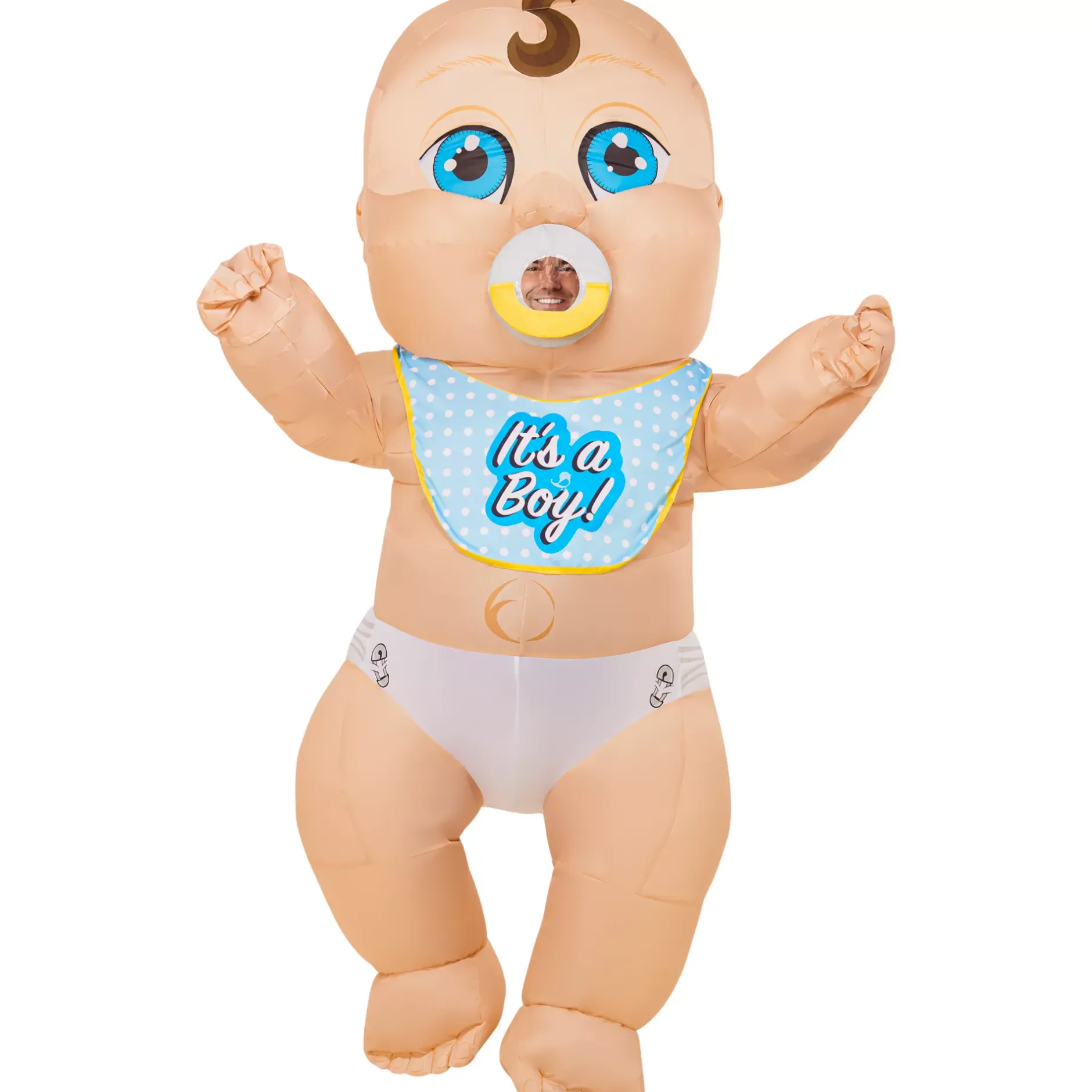 Make a BIG impression at your next gender reveal party or Halloween party in this adult inflatable baby costume! This costume includes a full-body jumpsuit featuring a sweet, blue-eyed baby face, a full back zipper, two bibs (one for a boy and one for a girl) and a battery-operated fan to keep things puffed to perfection.