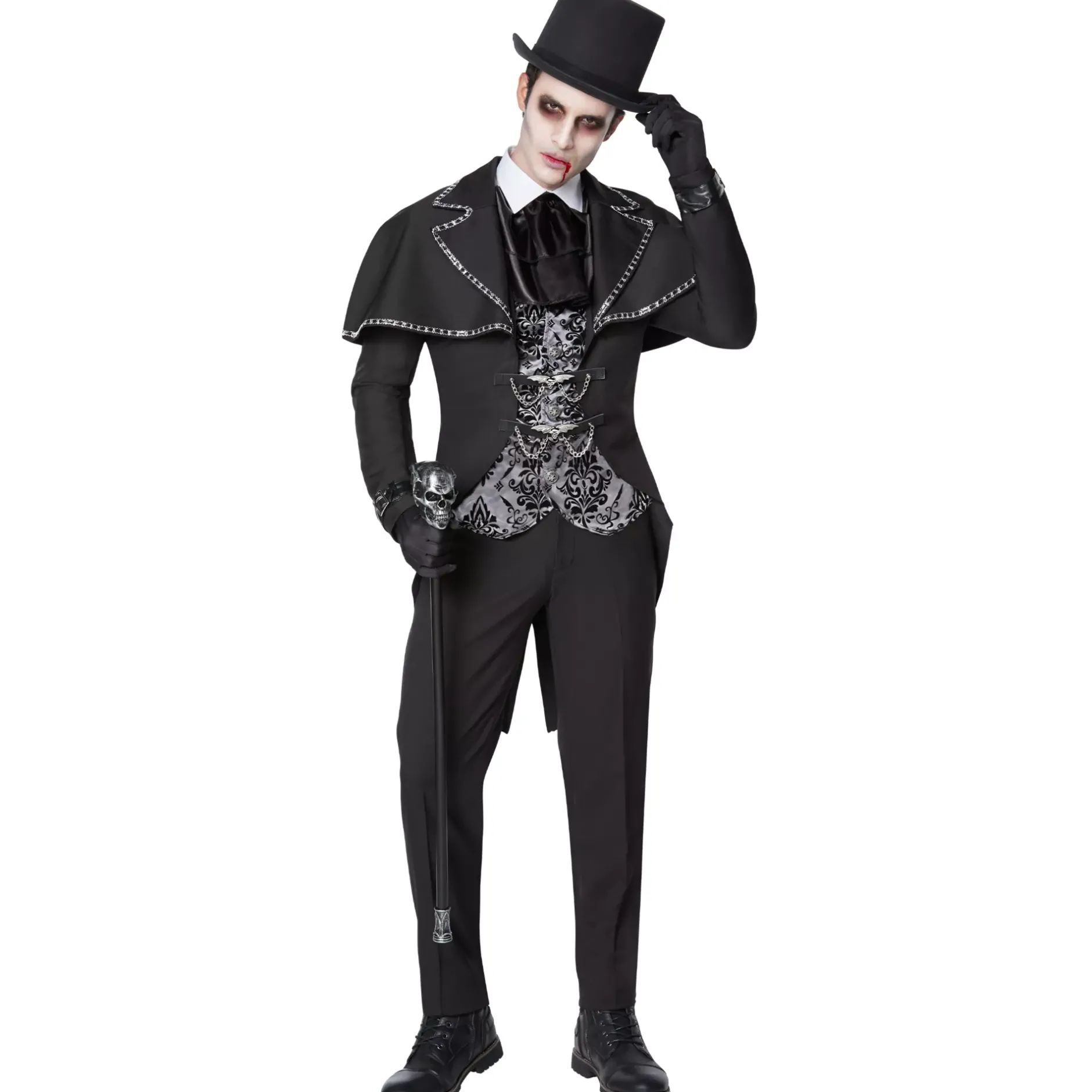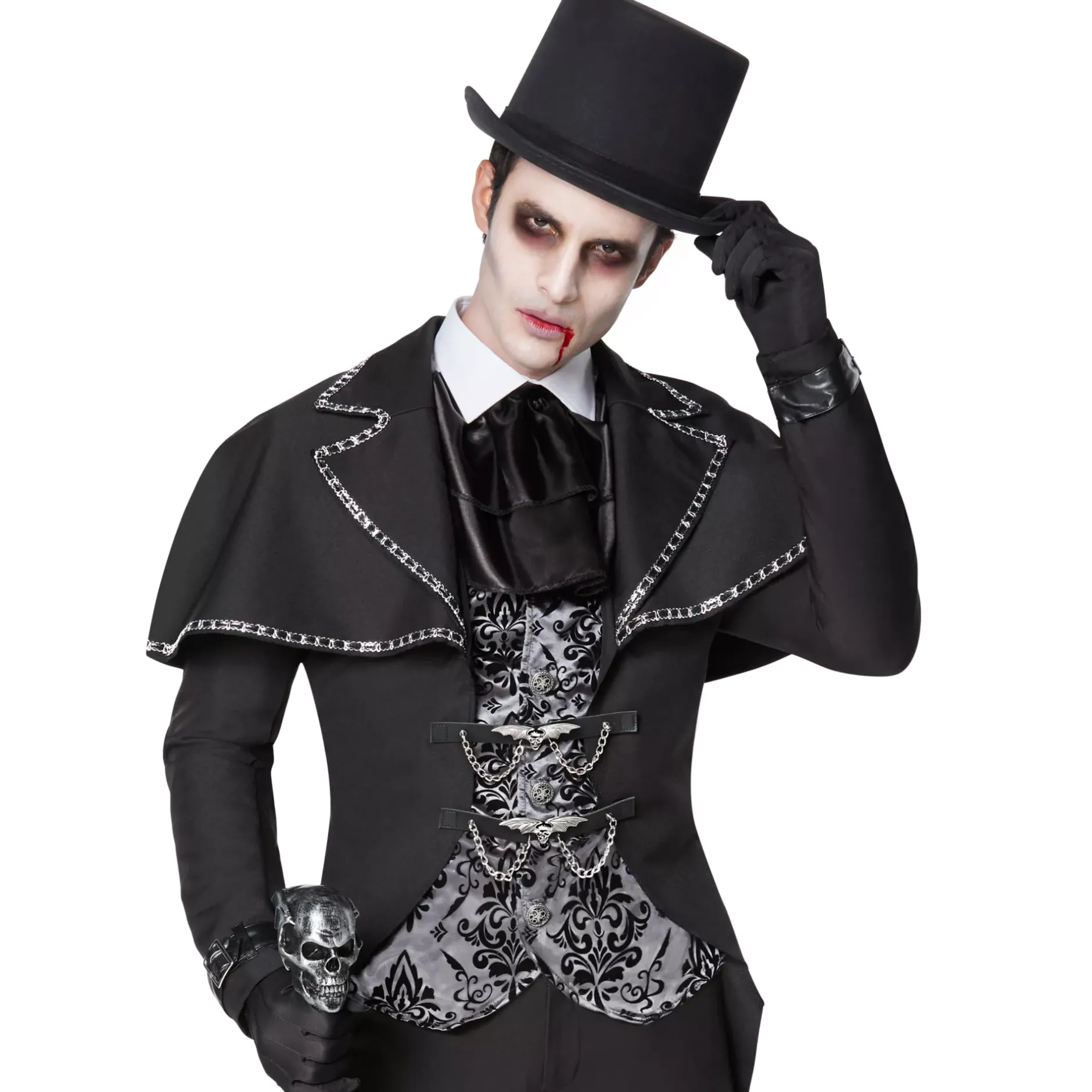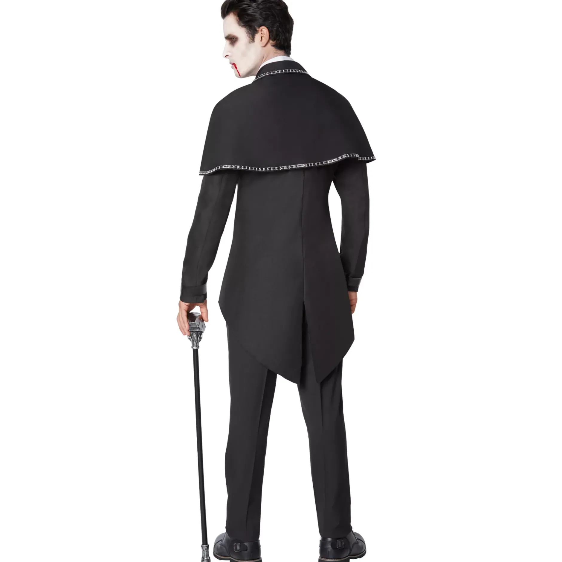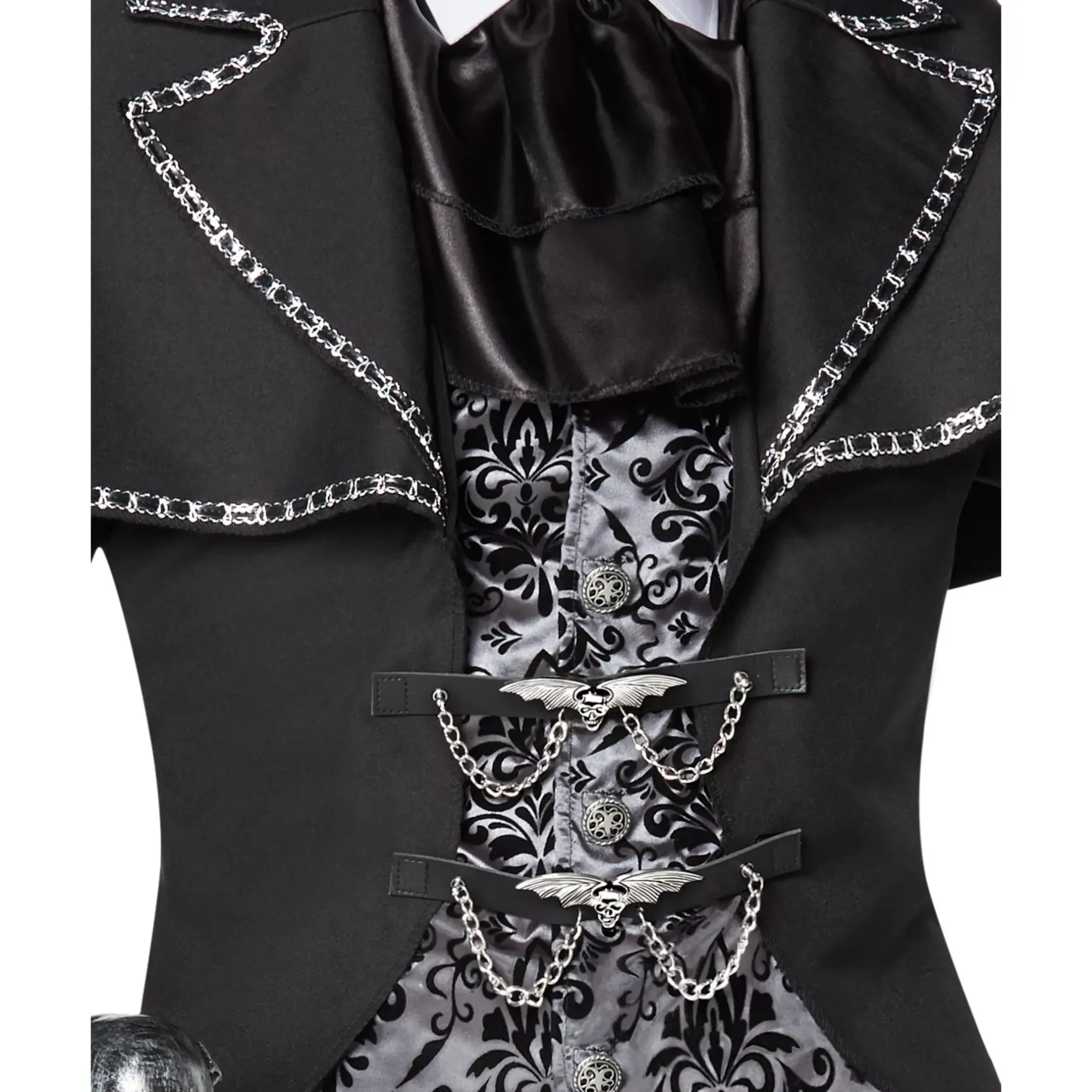 Embrace darkness in this midnight vampire costume! A long, black jacket features a dark shoulder cape and an attached damask-print vest. A ruffled neck tie adds a formal touch to this ornate ensemble. Bring this nightmarish look to completion with a skull-topped cane!