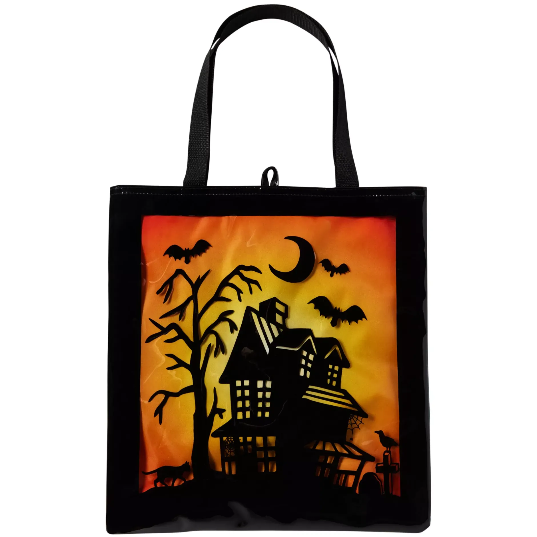 Carry your treats in this spooky haunted house tote bag! With a transparent panel, sturdy handles, and plenty of room for your favorite candy, this tote bag will make Halloween extra sweet.