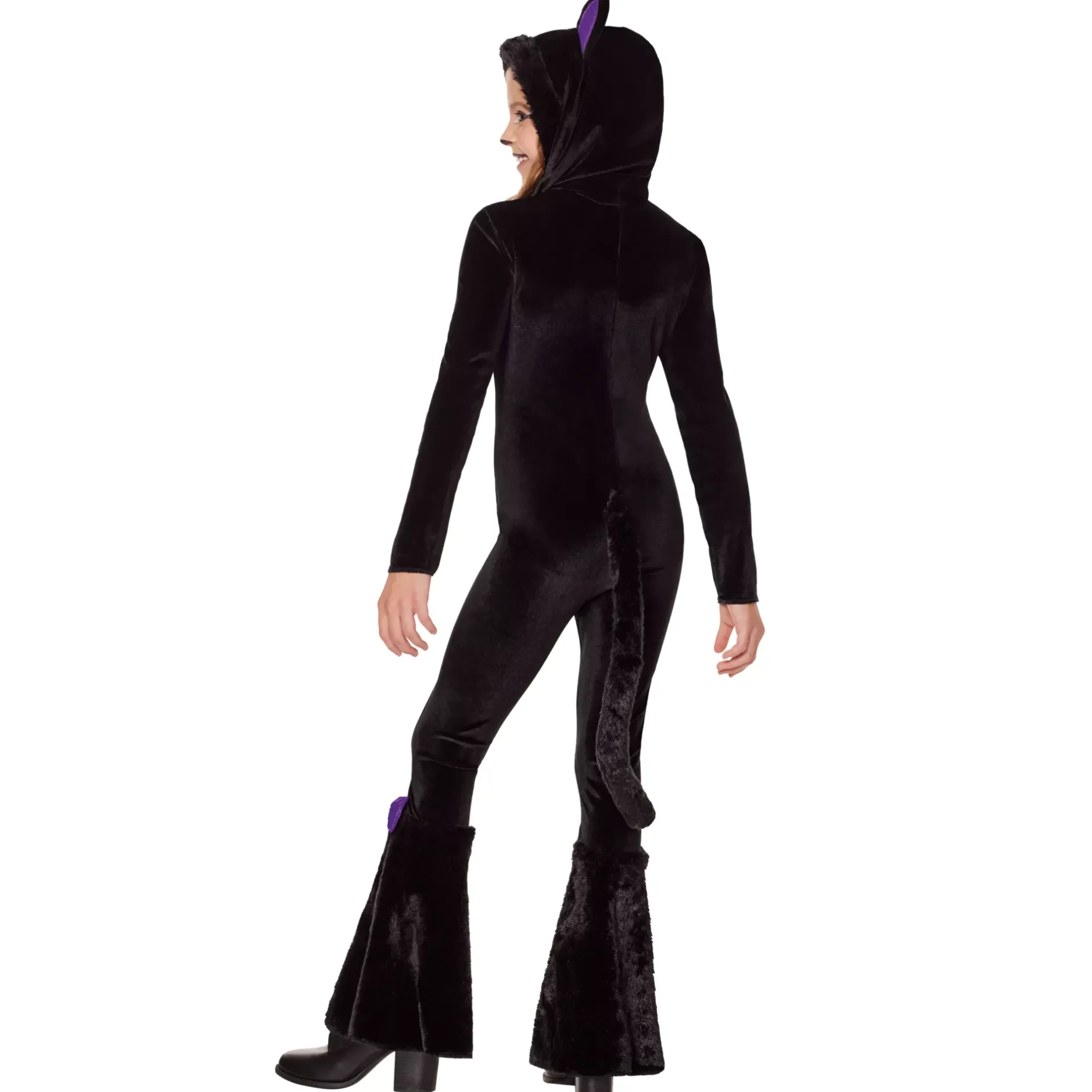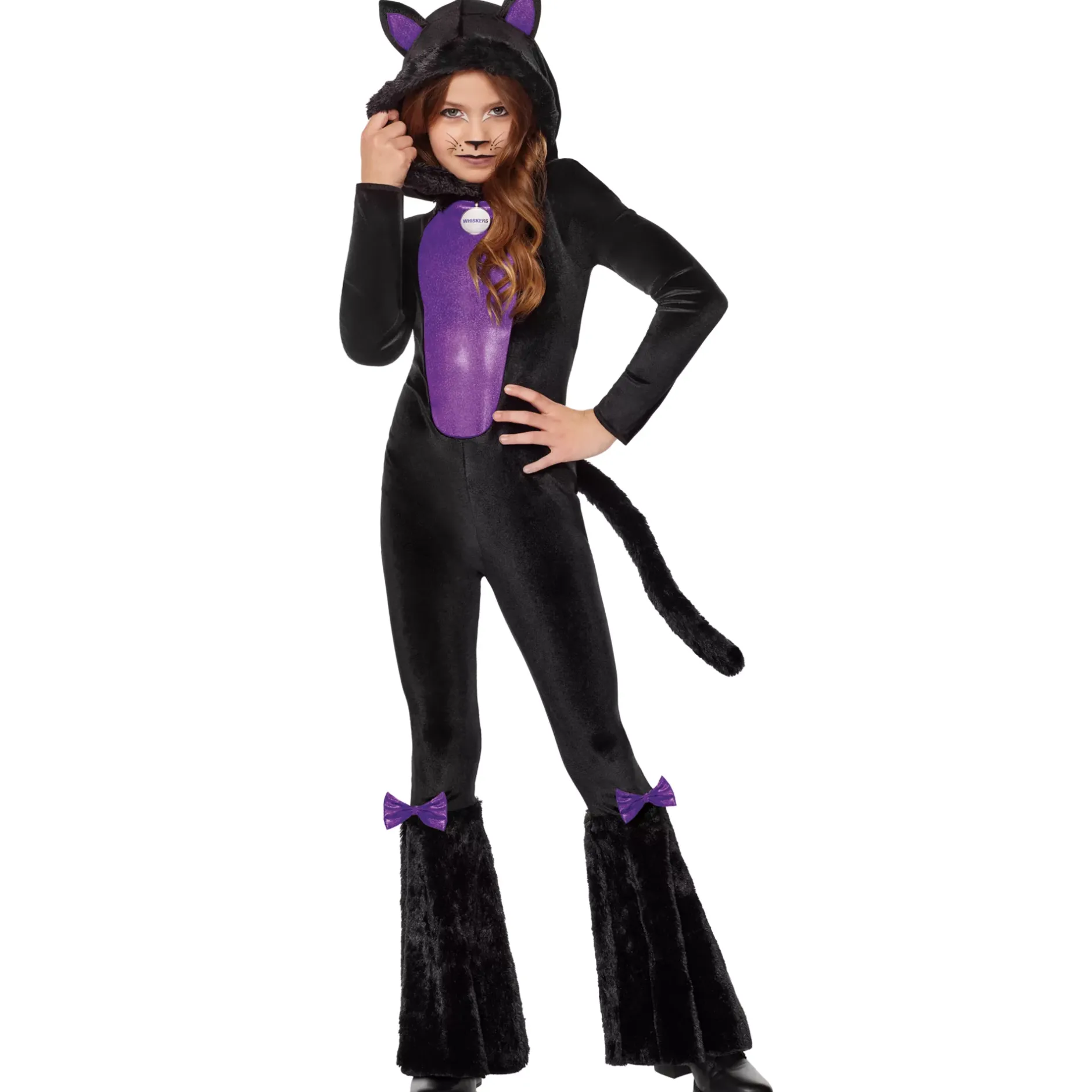 Live the simple life of a kitten on Halloween when you wear this Black Cat Child Costume complete with soft fur jumpsuit with attached tail, eared hood and bow tie.