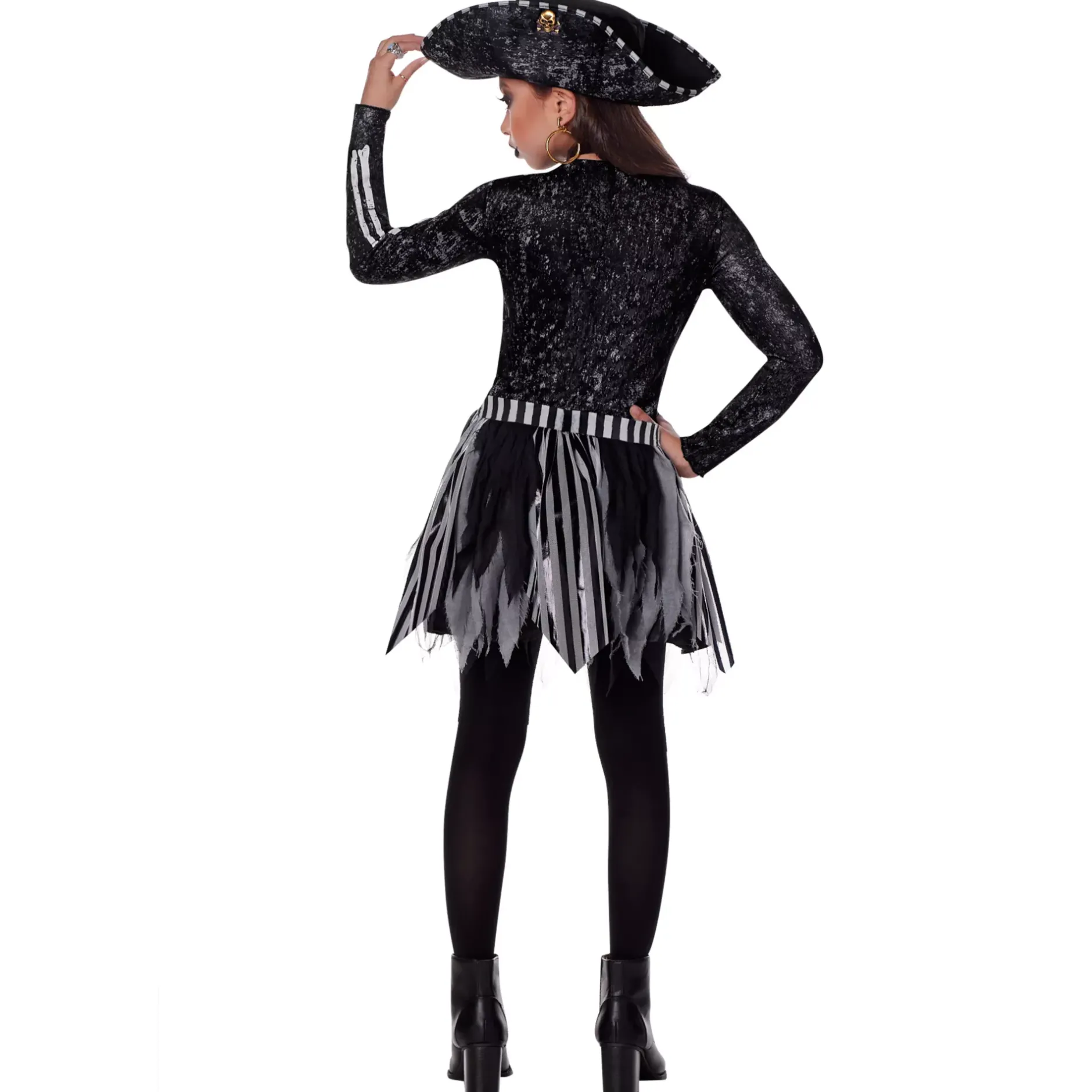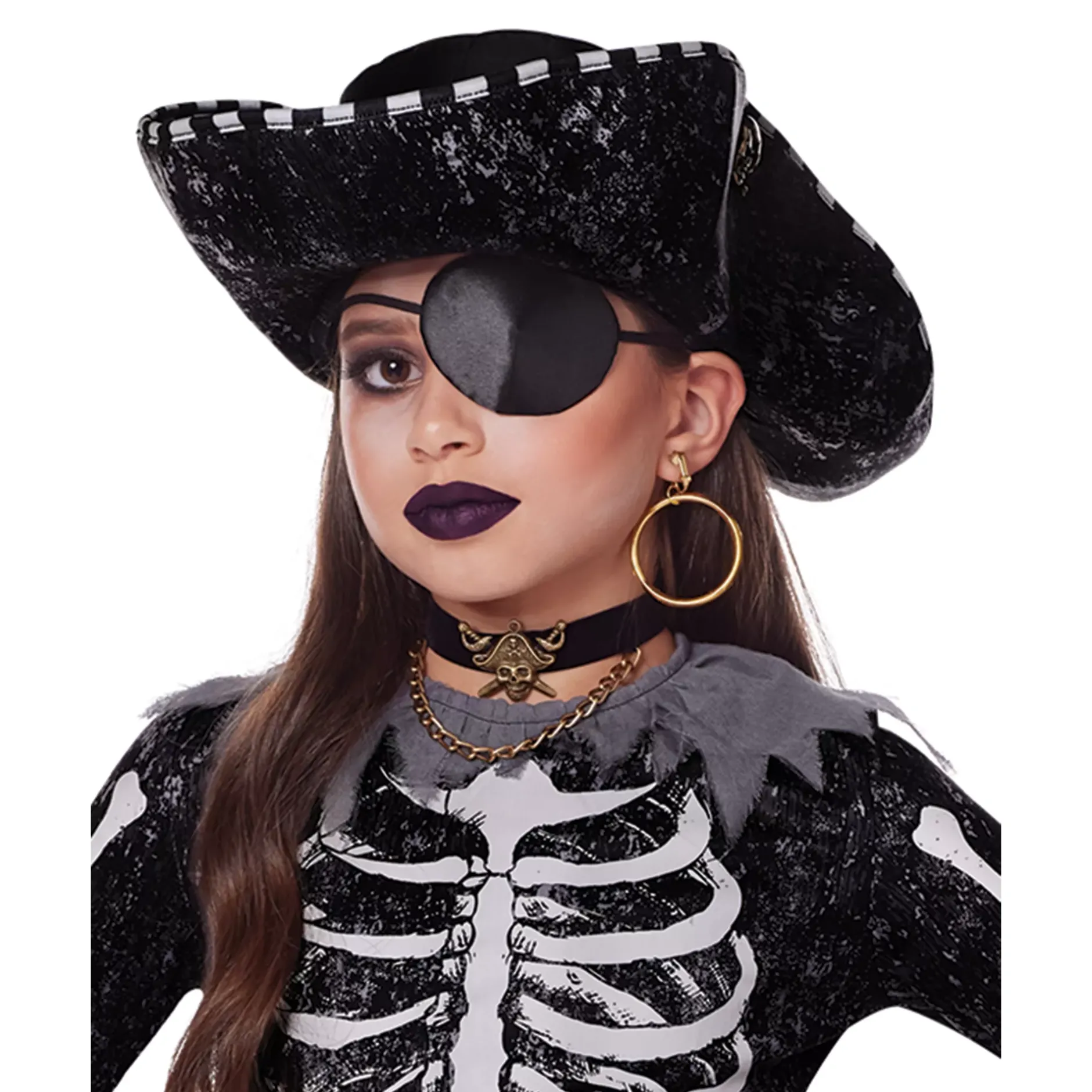 You’ll be ready to sail the seven seas when you put on this Kids Skeleton Pirate Costume this Halloween. This costume includes footless tights that features a boney skeleton design, a dress, a pirate hat, and a choker, transforming you into the deadliest pirate since Blackbeard!