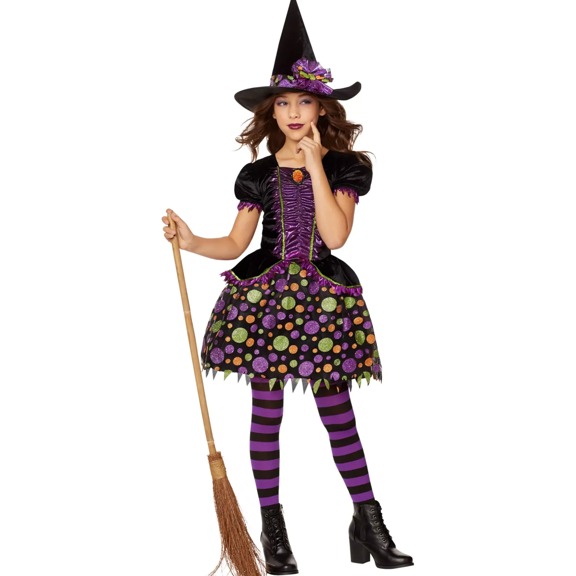 There’s nothing scary about this whimsical witch costume! With polka dot glitter detail, this adorable dress will have your little one shining all night long! The matching witch hat has a bendable brim, so you can create the perfect look for Halloween night. Slip into the included striped stockings and you’ll be ready for a night of whimsical fun!