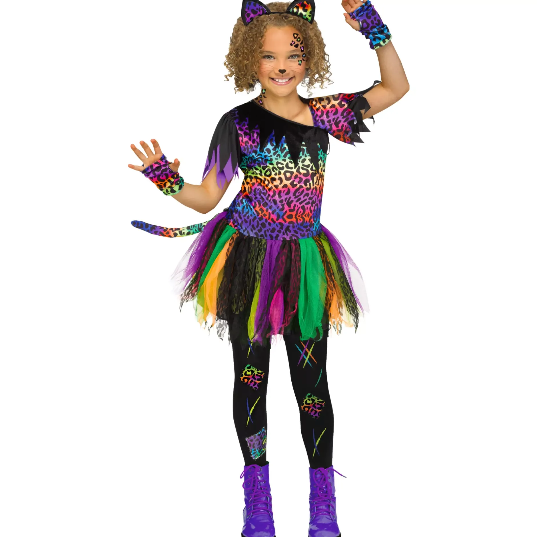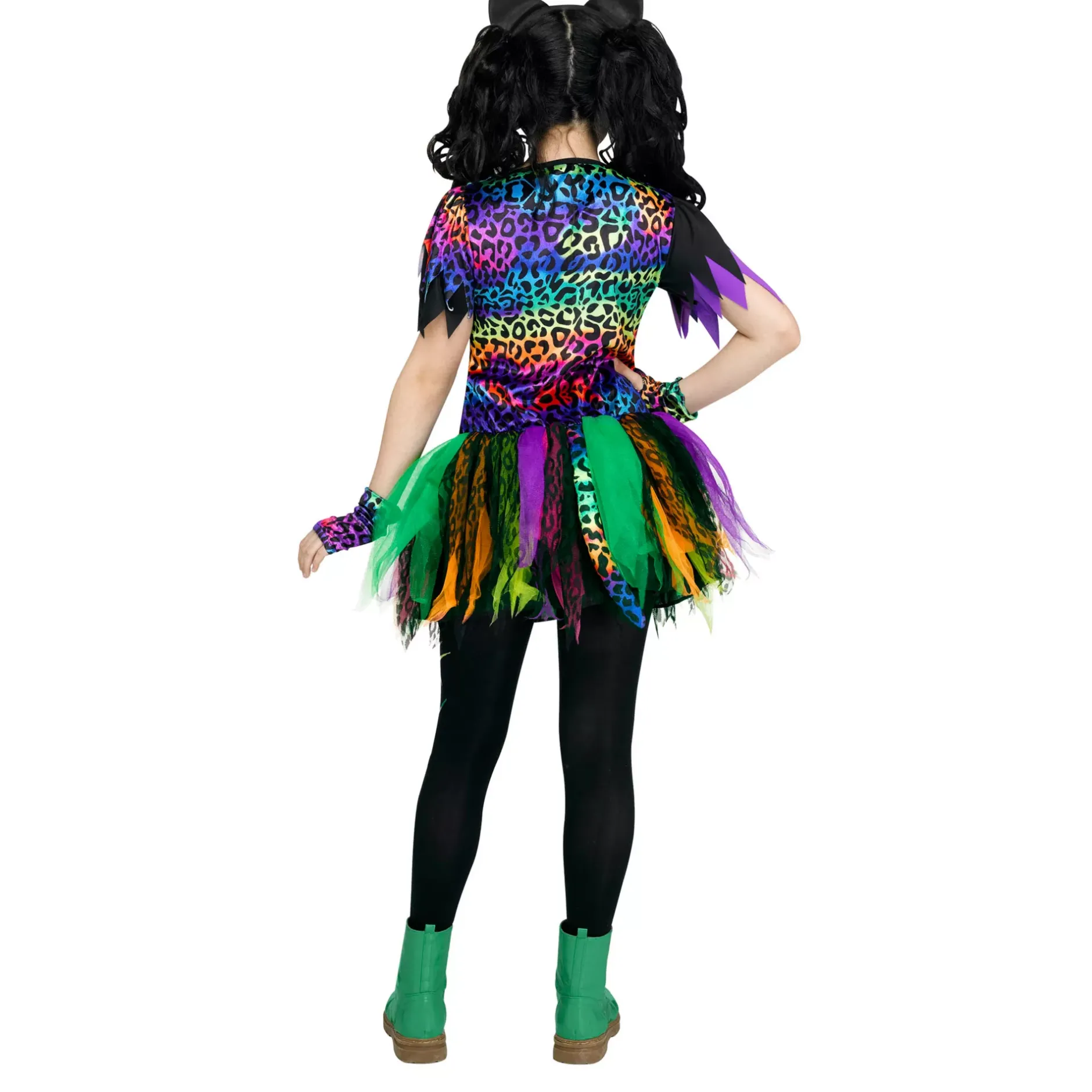 Bring out the claws this Halloween with style when you dress up in this Kids Wild Rainbow Cat Costume. This colorful costume is the perfect match for your feisty personality featuring a leopard print rainbow dress, glovettes, tights, and a rainbow cat ears headband. There’s no better way to show off your wild side this Halloween than with this colorful cat costume.