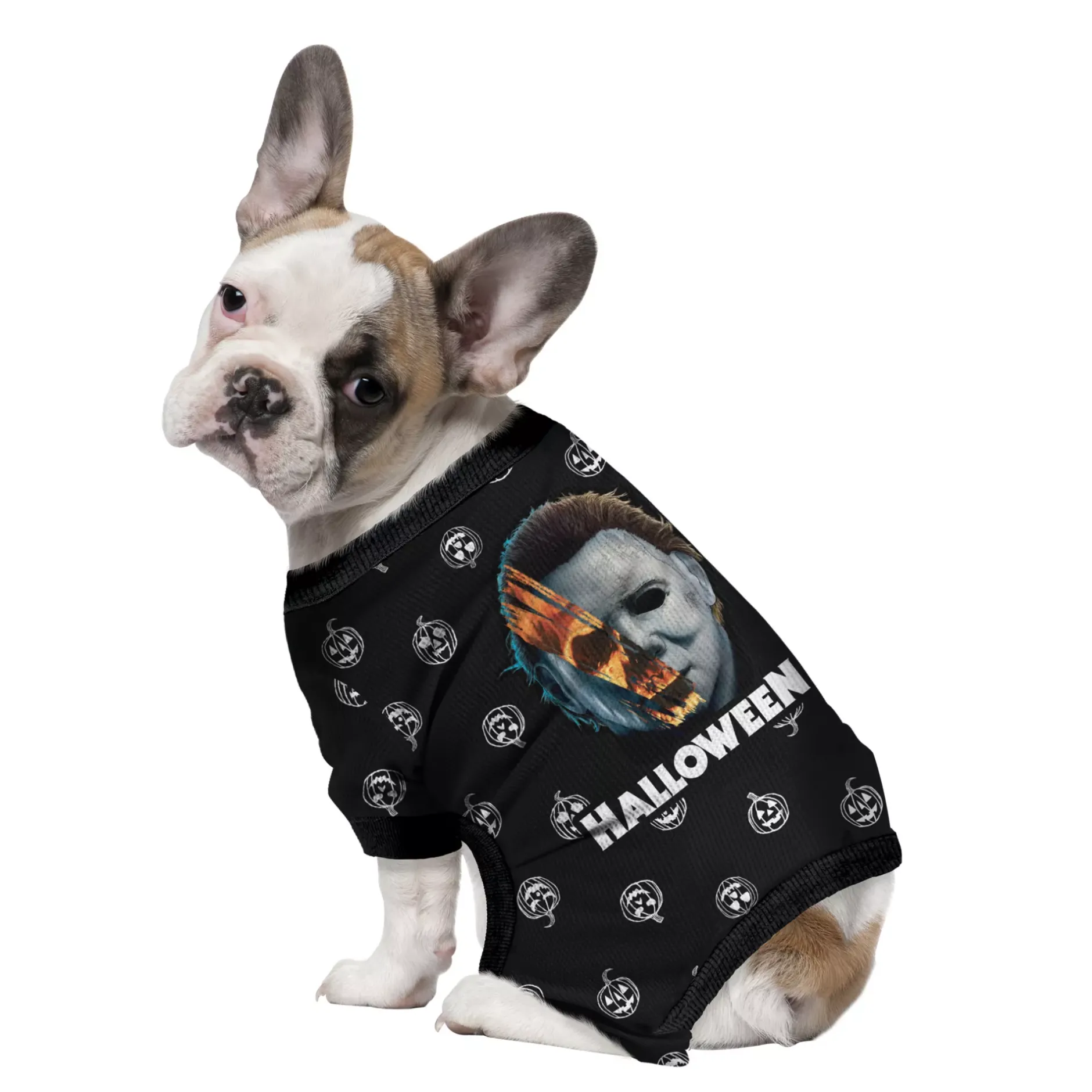 Your pet will be the spookiest on the block in these Michael Myers pajamas! This officially licensed pet costume features a haunting image of Michael Myers surrounded by grinning pumpkins.
