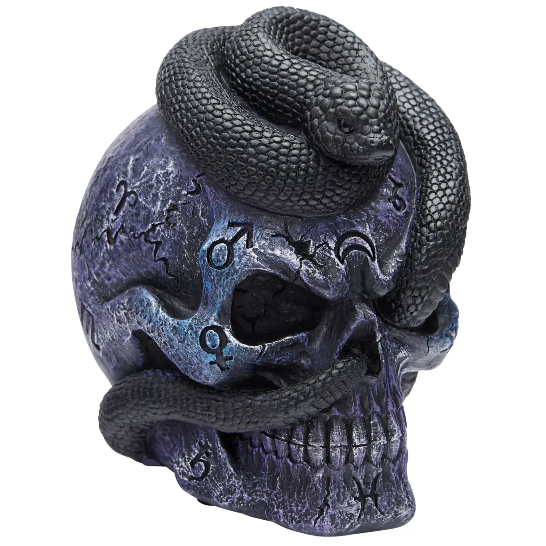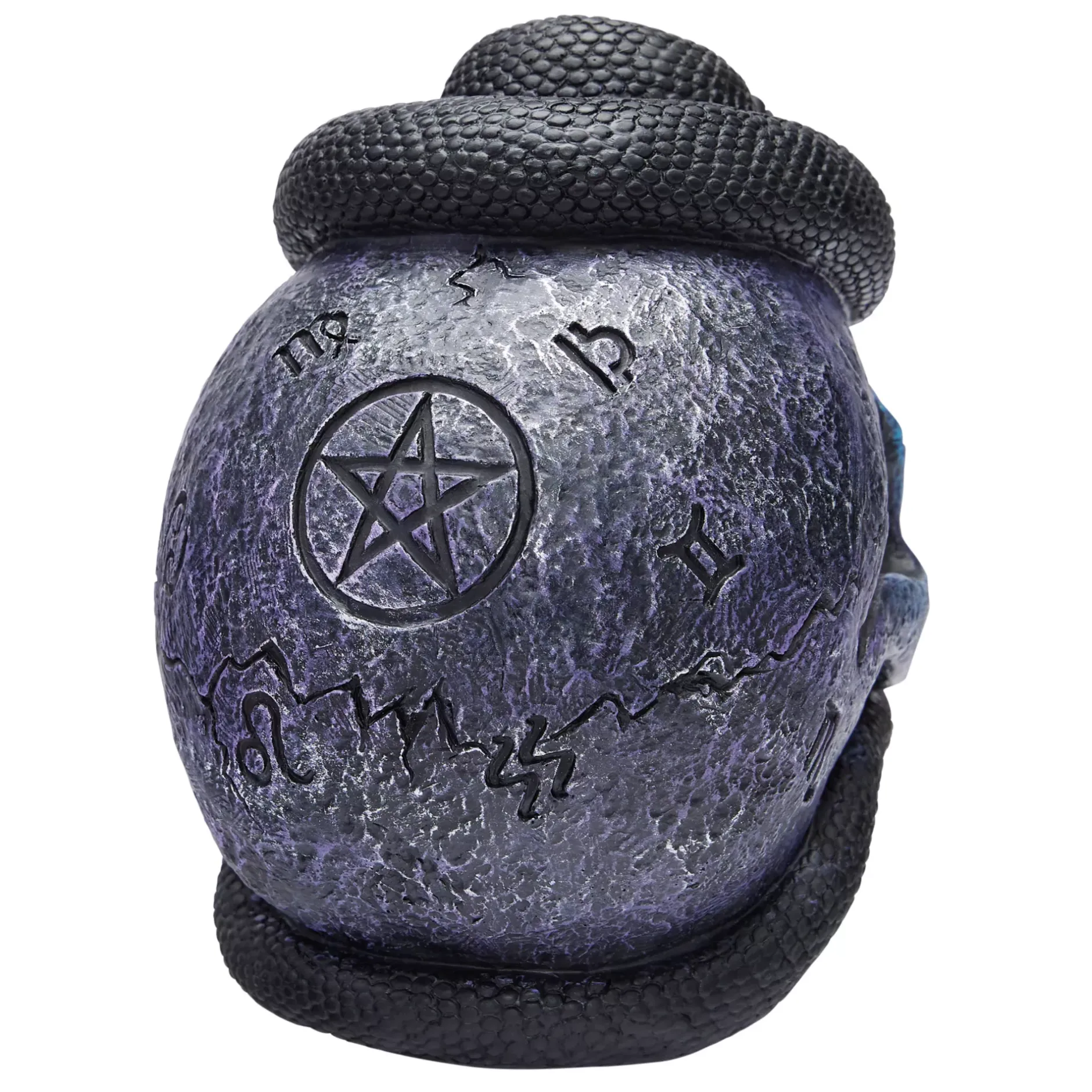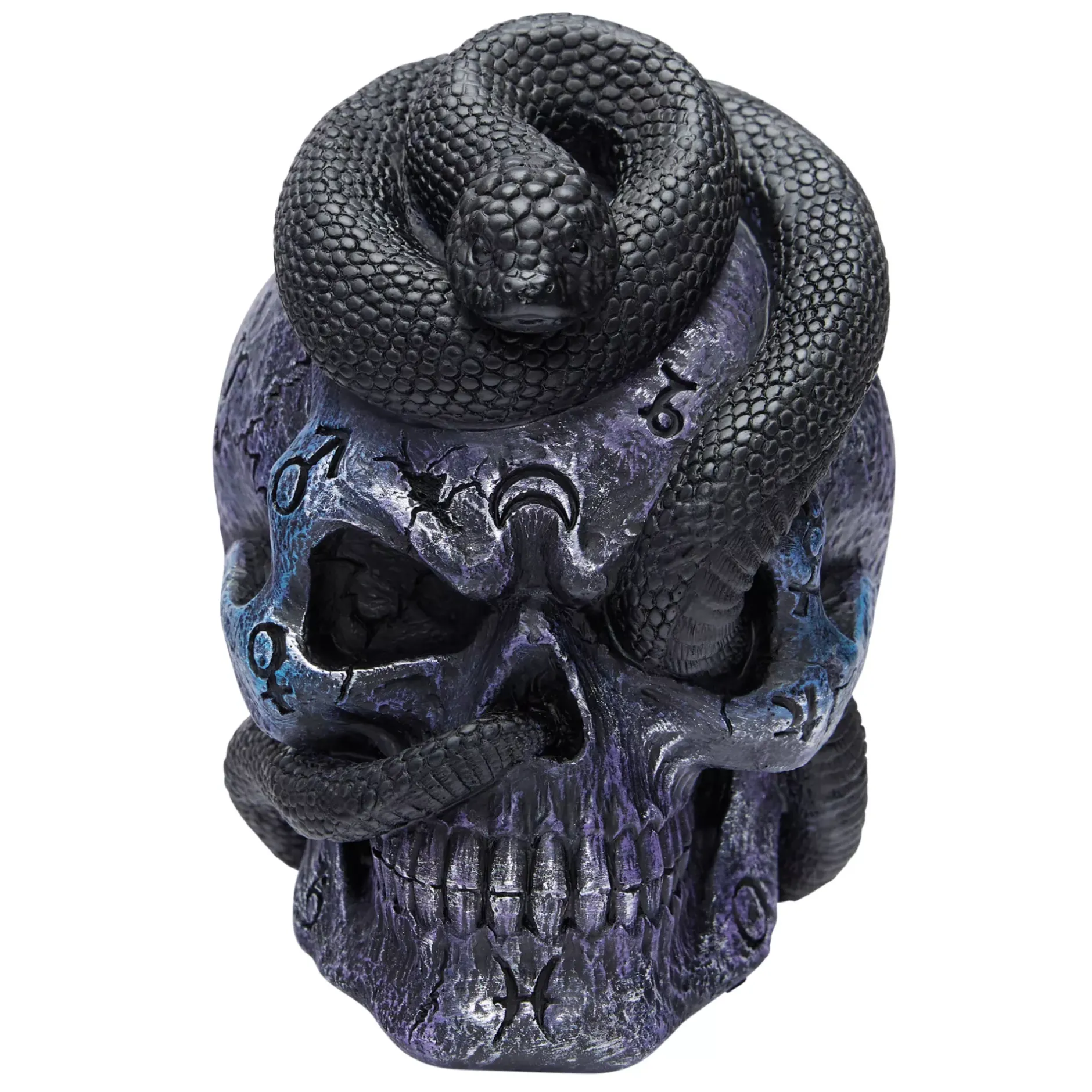 What scares you more, skulls or snakes? This terrifying tabletop decoration features a scowling skull with a black snake crawling through its eye and nose. Display this chilling decoration to get the spooky vibes flowing!