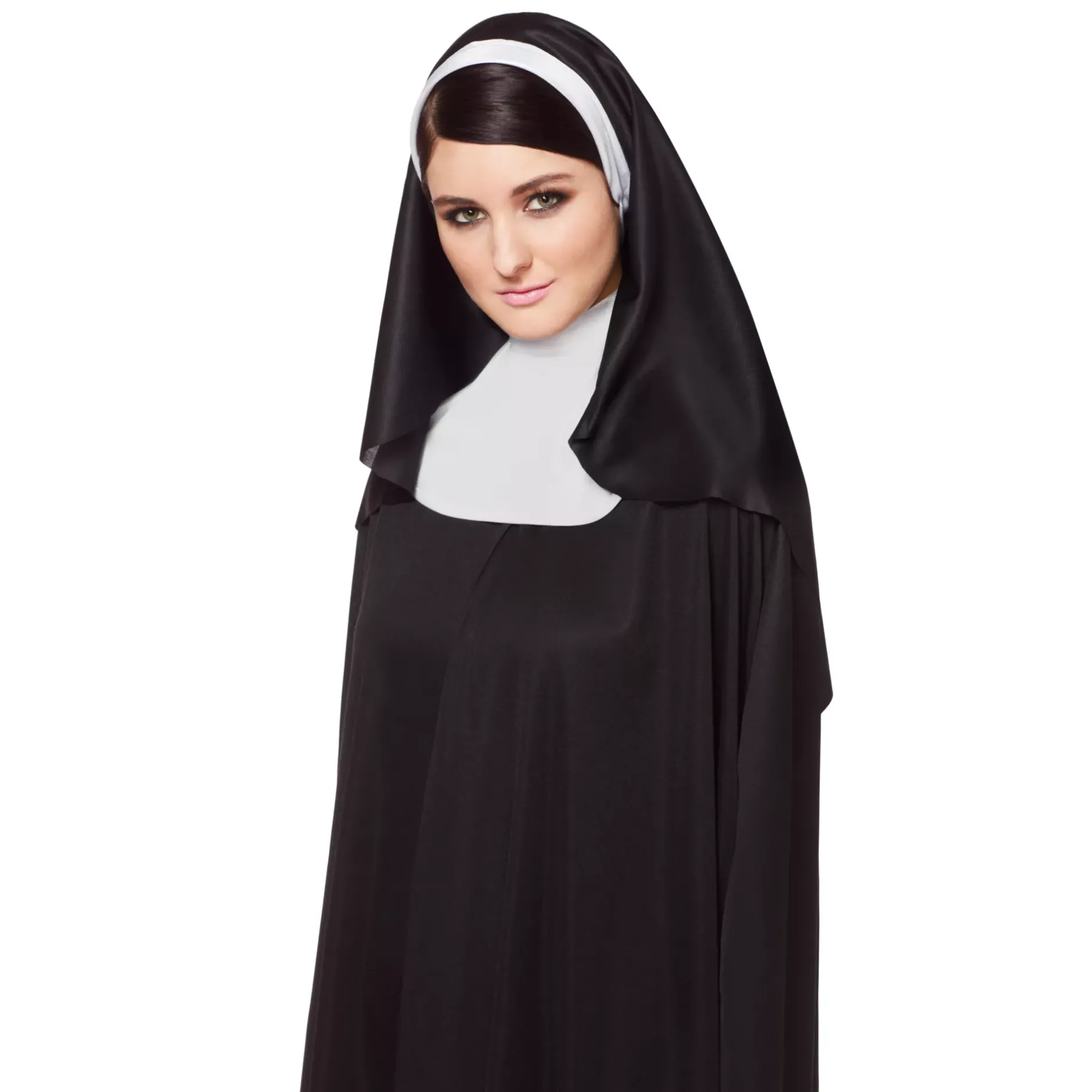 Complete your costume with this Nuns Kit Headpiece and Collar. White collar fits conveniently over black robe (not included) and white headband with attached black veil matches accordingly. Good luck keeping your vows to the church on Halloween!