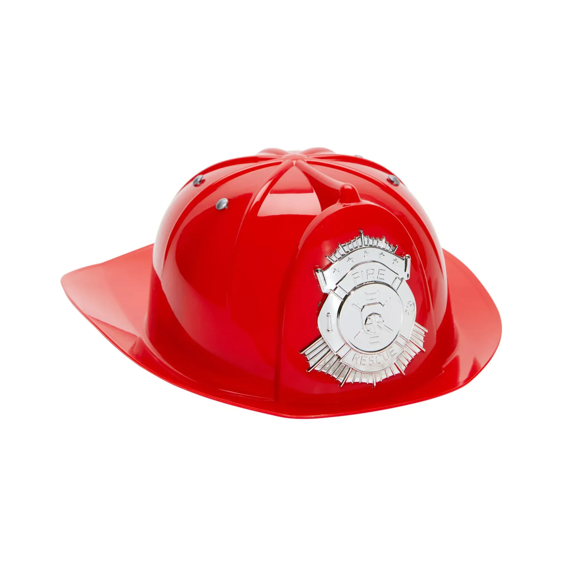 - The red Fire Chief helmet is made of plastic and bears a black and white printed Fire Chief badge.