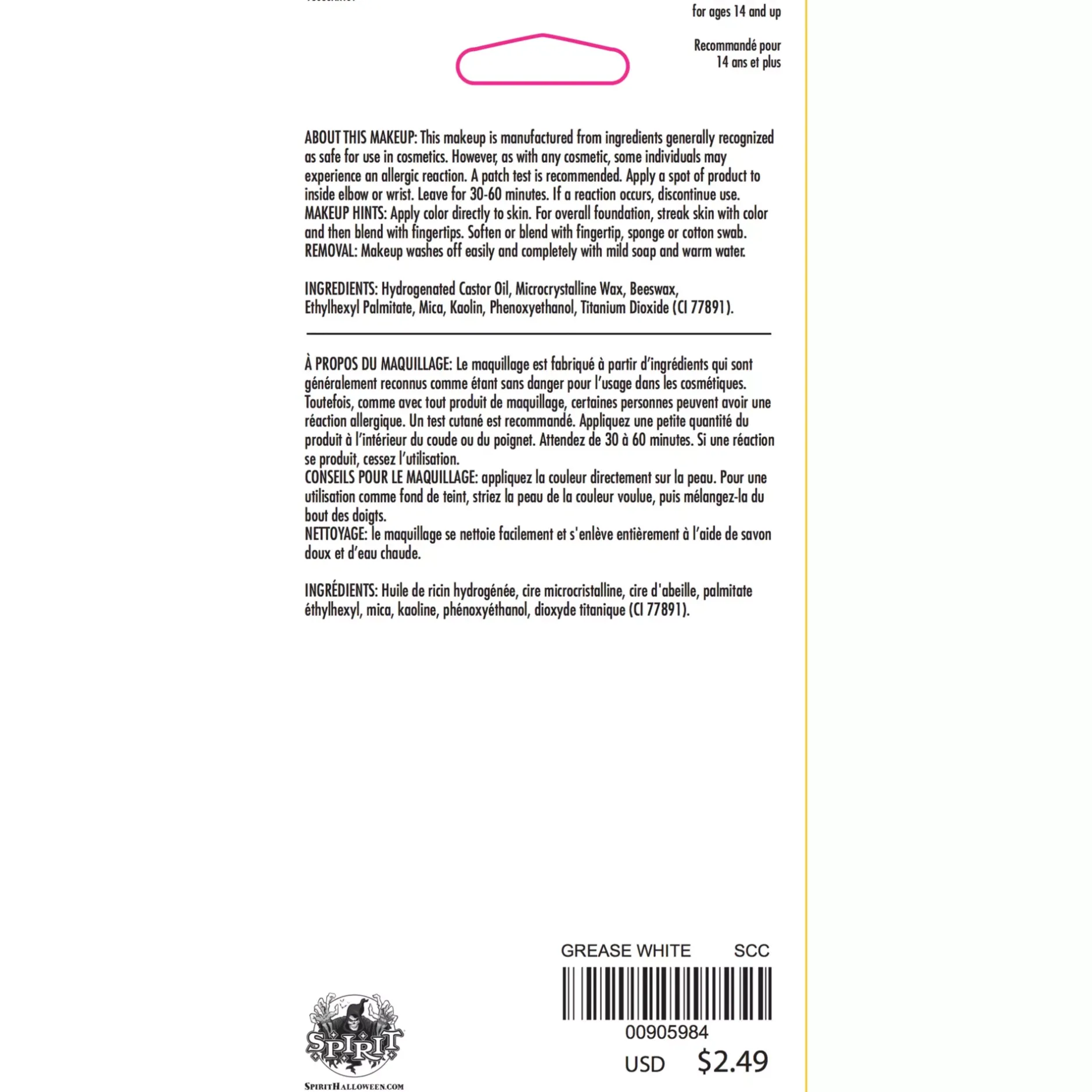 This Spirit Exclusive White Grease Makeup can make a clown out of anyone this Halloween! The 1 oz. tube is perfect for vampires, clowns, mummys, ice effects or any other ghostly blended look you can think of. It’s easy to apply, easy to wash off and looks great!