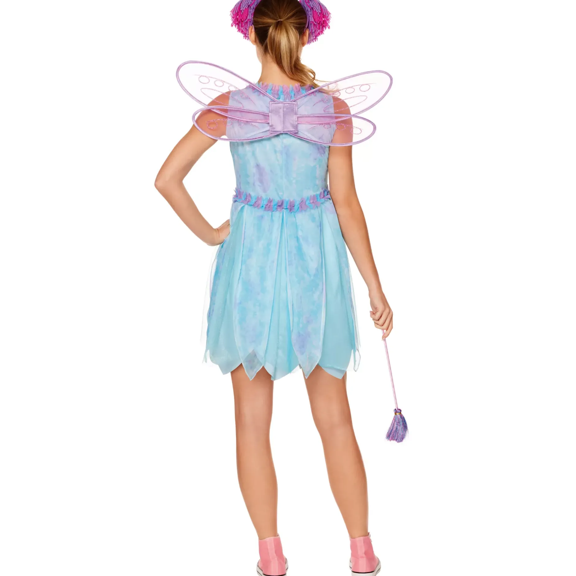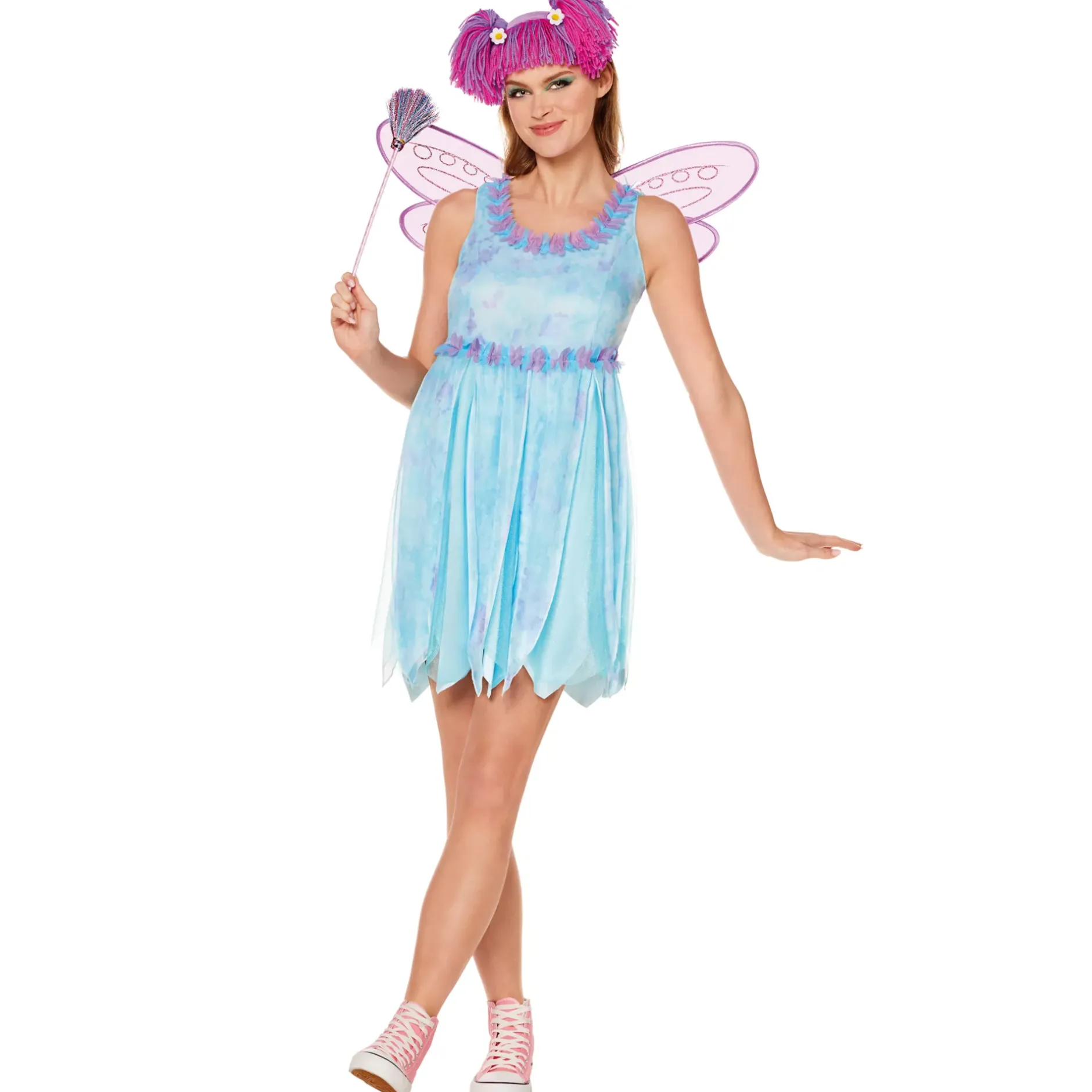 Dress like the magical Abby in this officially licensed Sesame Street costume! This adult costume includes a sleeveless mini dress with a scuba knit base topped with dreamy organza. Pretty petals in blue and purple hues adorn the neckline and waist. Finish the look with a pom pom wand, glittery wings, and a headband featuring Abby’s signature hairstyle.