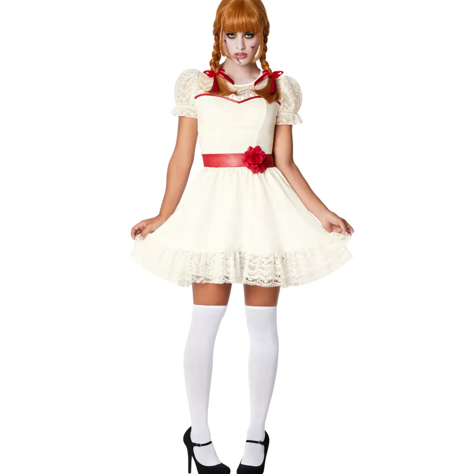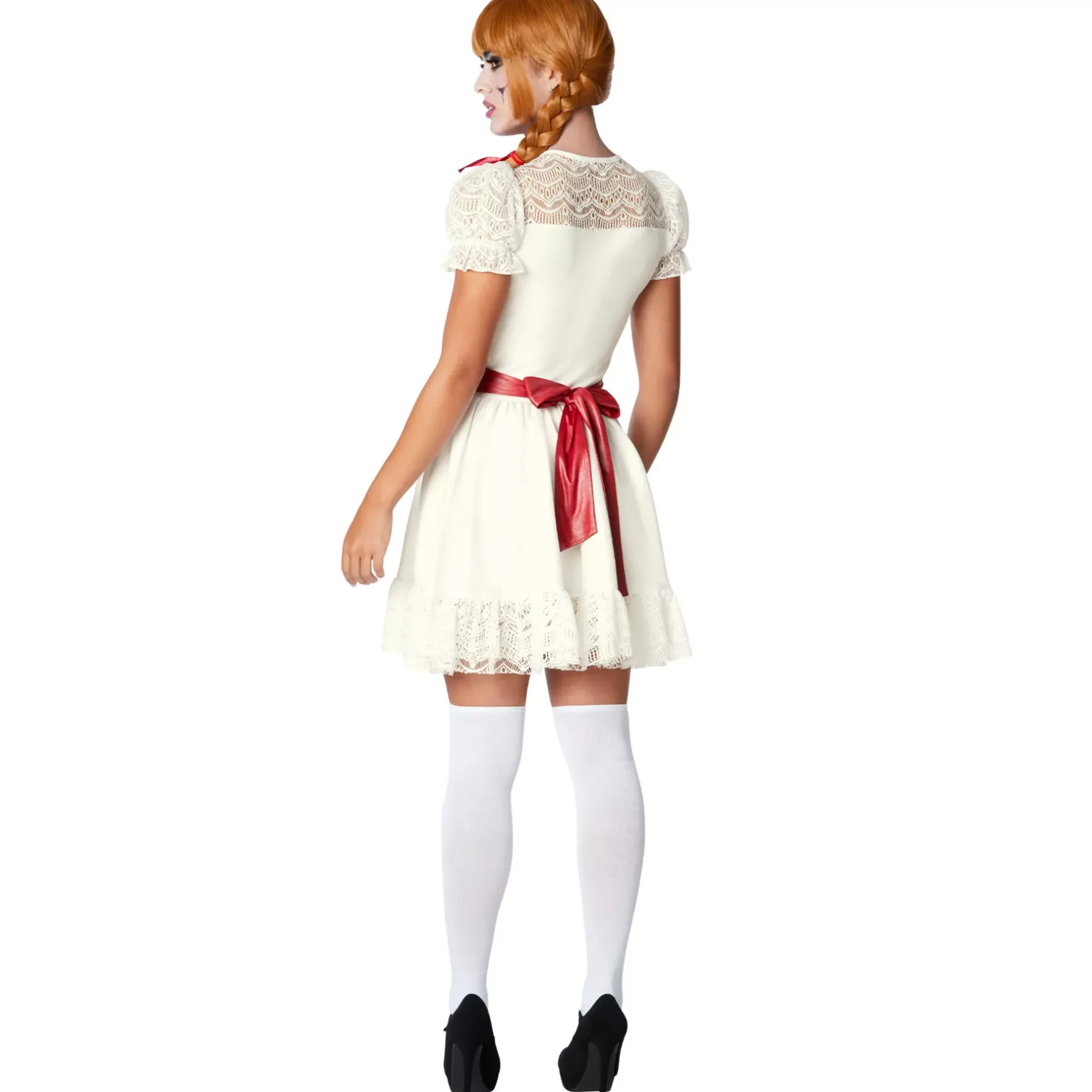 Become the creepy, spirit-conjuring doll that everyone fears when you wear this incredible costume to your Halloween get-together. This officially licensed Adult Annabelle Short Dress Costume includes a wig and the iconic white dress from the movie!
