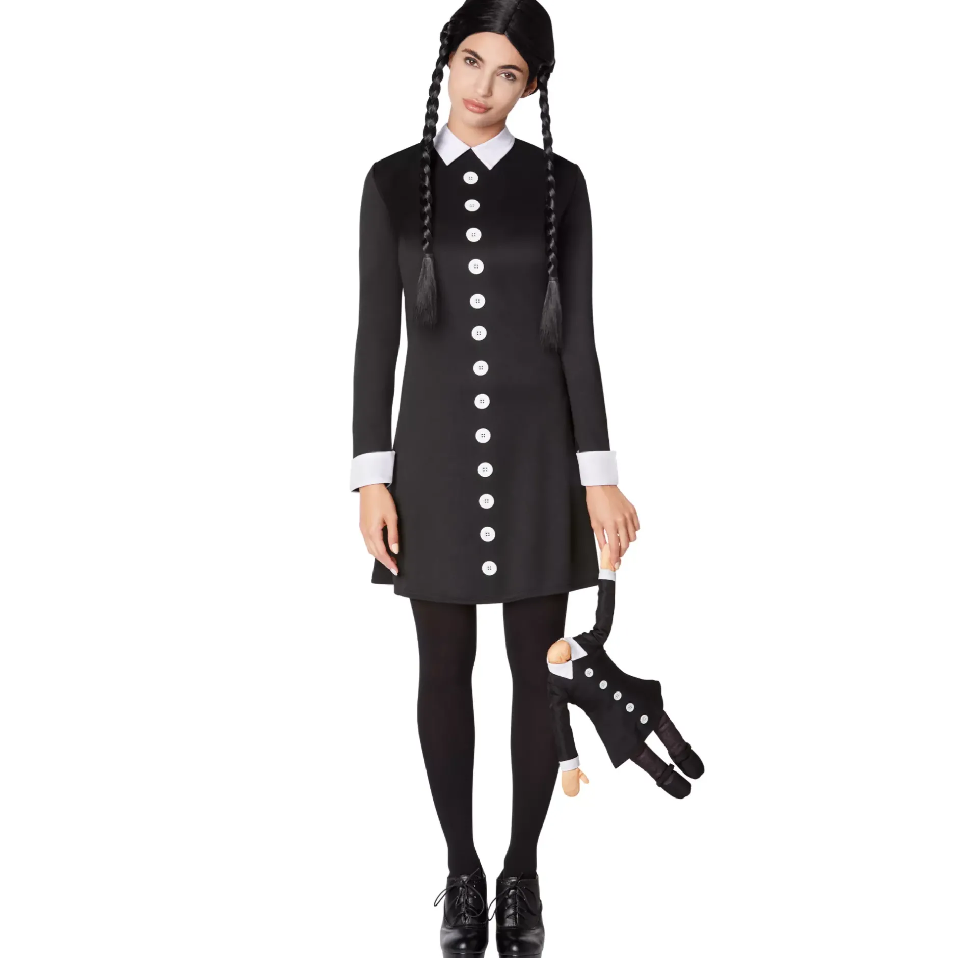 Wednesday’s child is full of woe! Transform into the sweet and spooky Wednesday Addams when you slip into this costume. Featuring a black dress with a white collar, white cuffs, and button details, you’ll feel like Wednesday Addams as soon as you put it on. Top off the look with black tights!